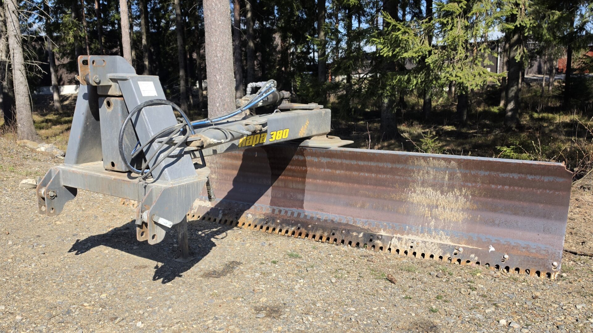 Hyvillä varusteilla oleva leveä perälevy hydraulisella käännöllä ja sivusiirrolla. Heikot paikat löydetty ja vahvistettu. "Puolikasterä" jäljellä. Tässä lanaa vielä pitkäksi aikaa!
